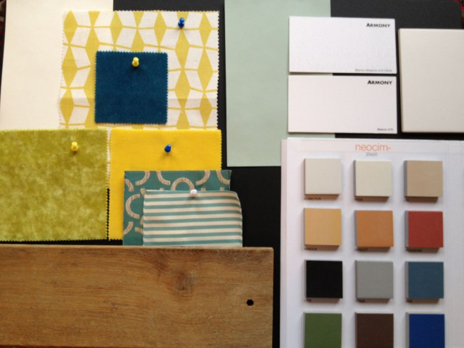 Lorsque je travaille sur un projet de décoration, je réalise une planche de matériaux à l’aide d’échantillons pour bien associer couleurs et matières. Vous avez ici un exemple de planche dans les tons de vert et jaune.