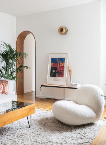 Ce salon fait en bon dans la machine à remonter le temps pour nous ramener dans les années 60/70, avec ce canapé en pièce maîtresse, en tissu en laine bouclette de chez NV Gallery.