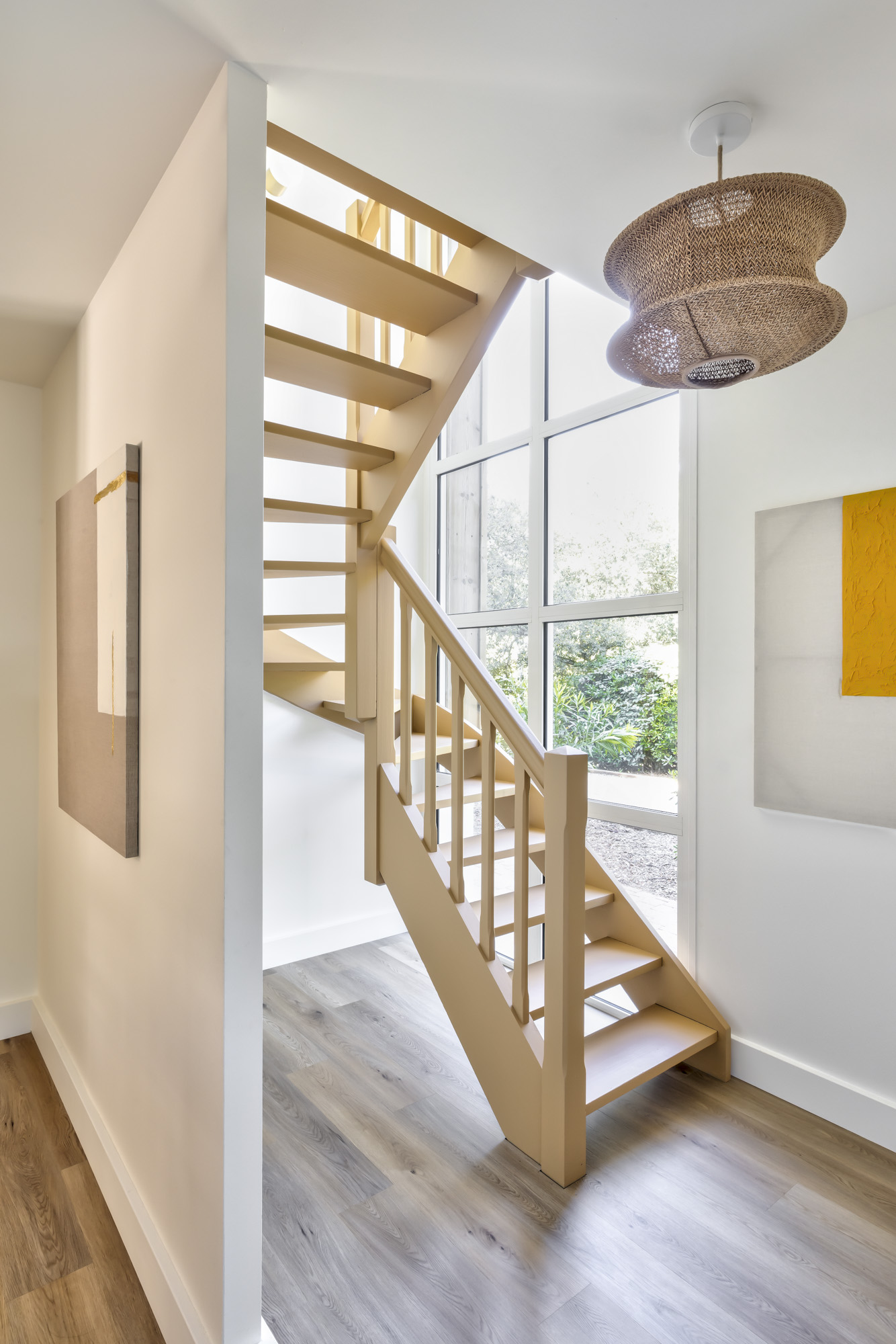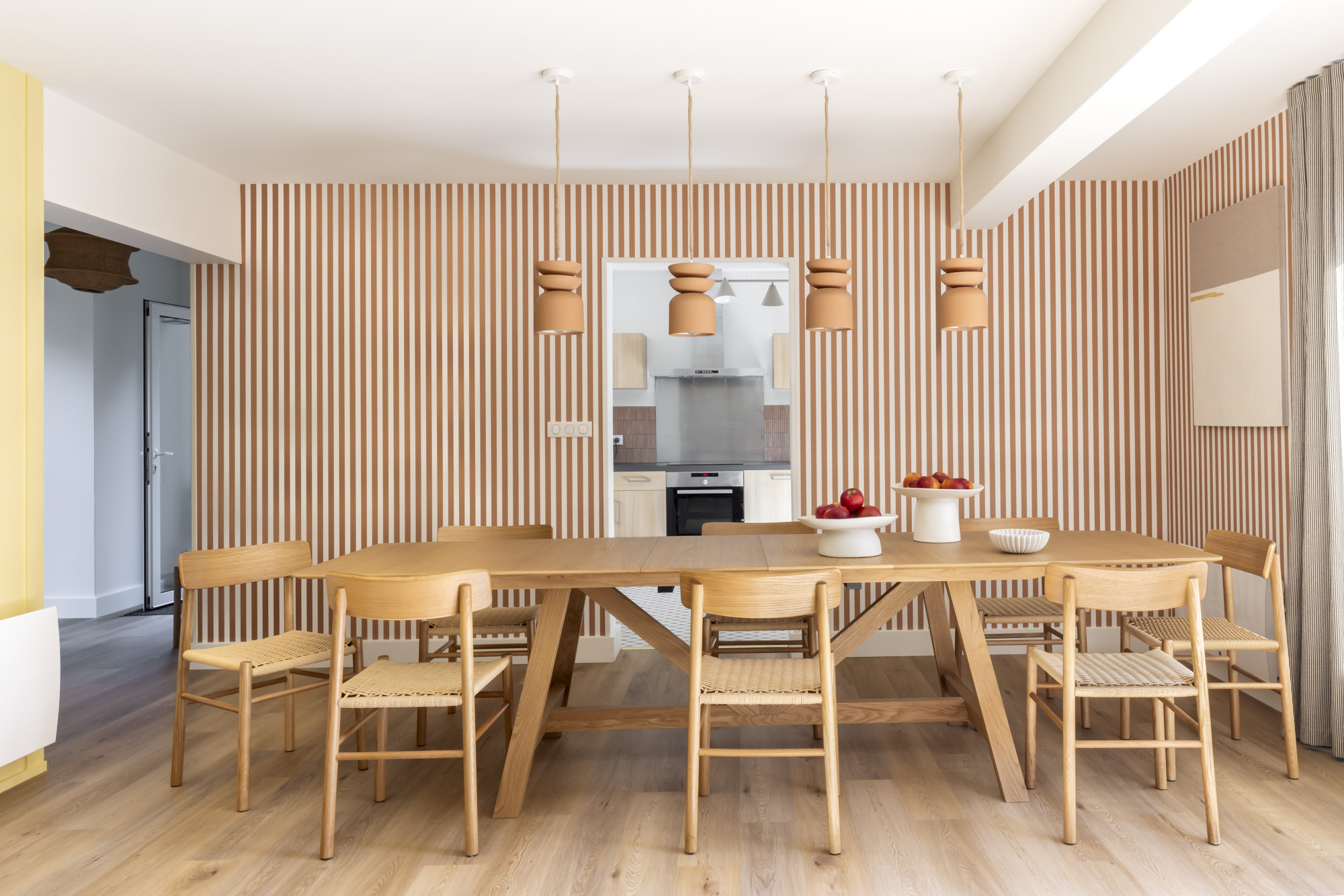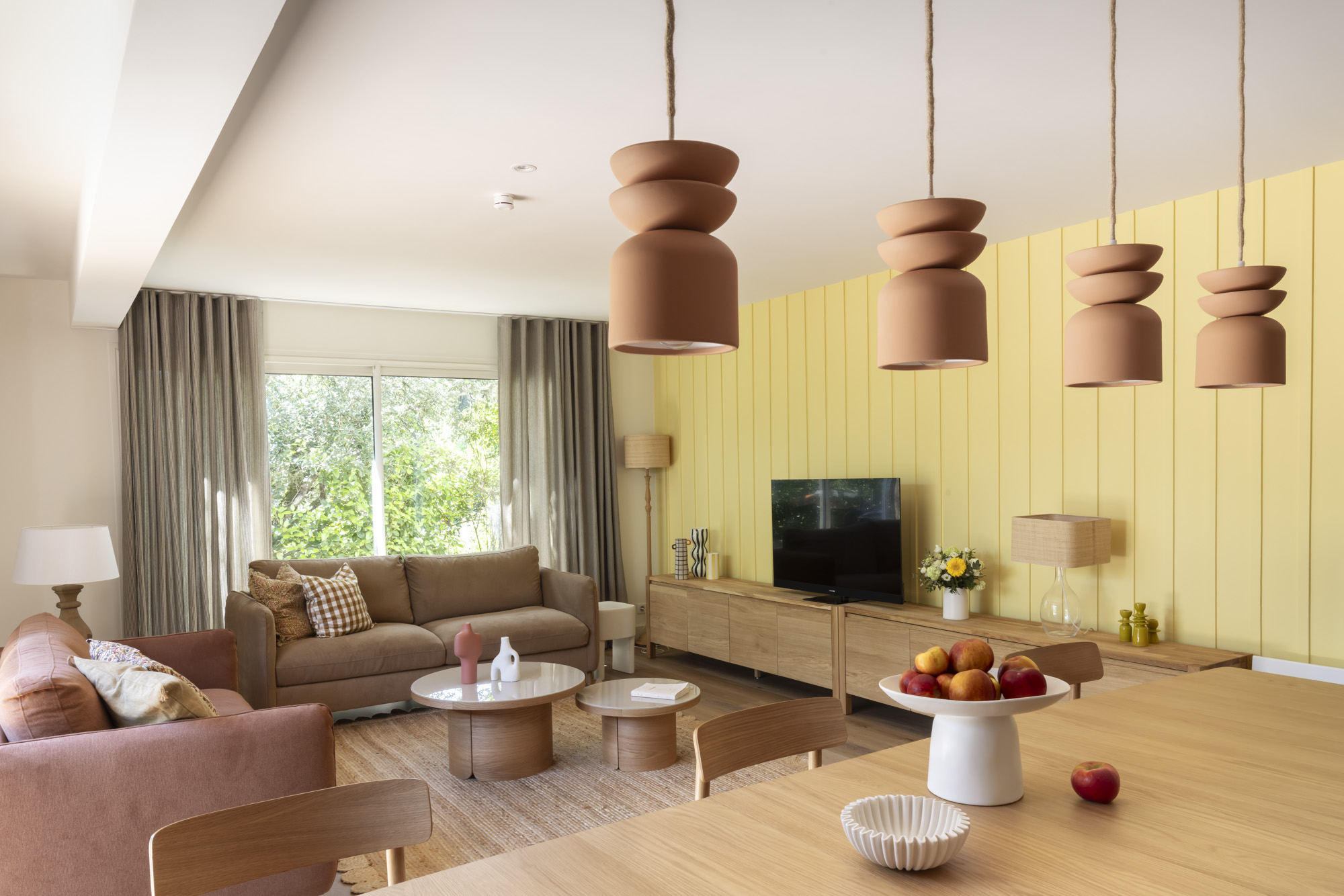 Dans cette élégante villa à Arcachon, la décoration mise sur la chaleur et la lumière naturelle. Les tons jaune lumineux et terracotta créent une ambiance solaire et accueillante, sublimée par des suspensions en terre cuite qui apportent authenticité et caractère.