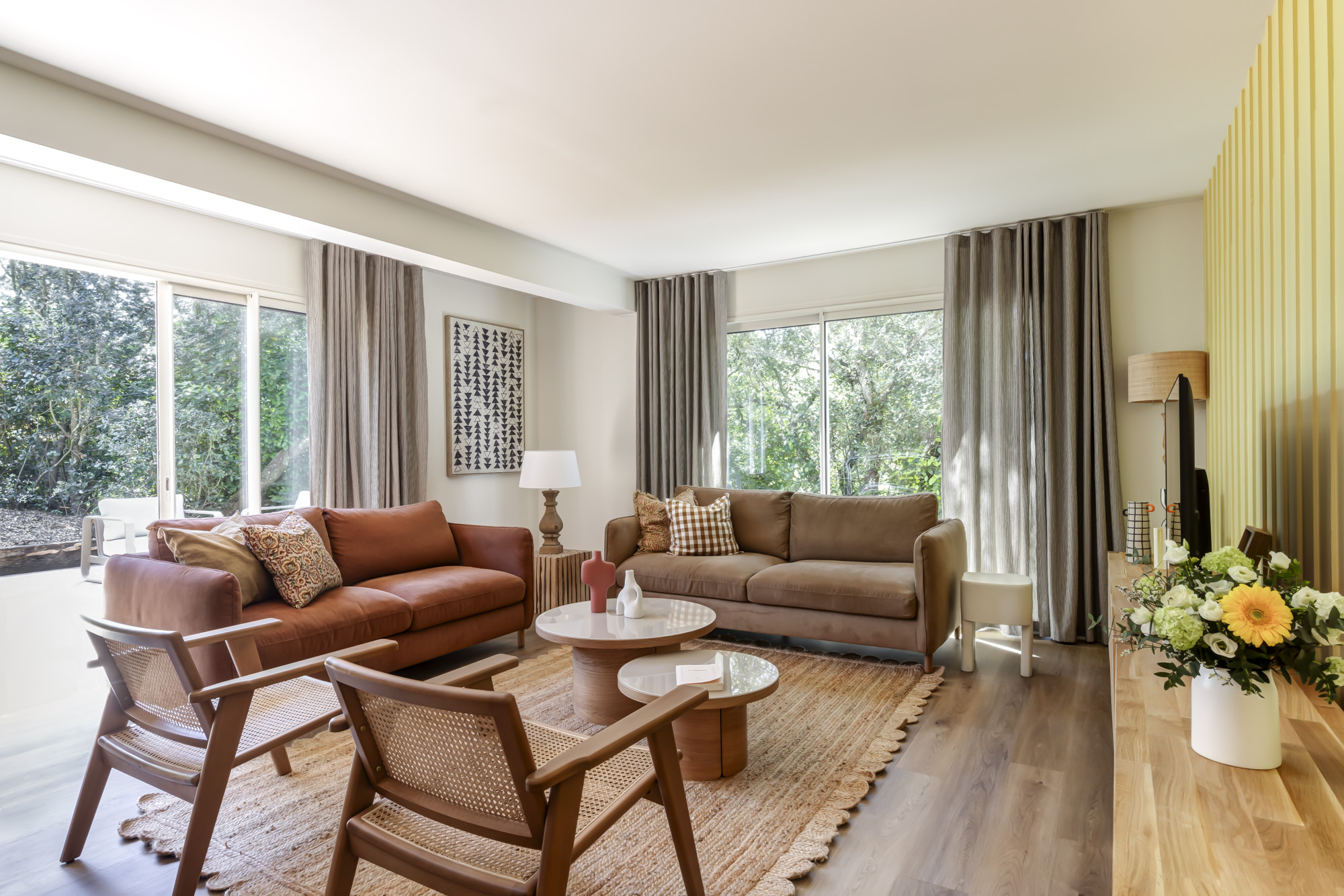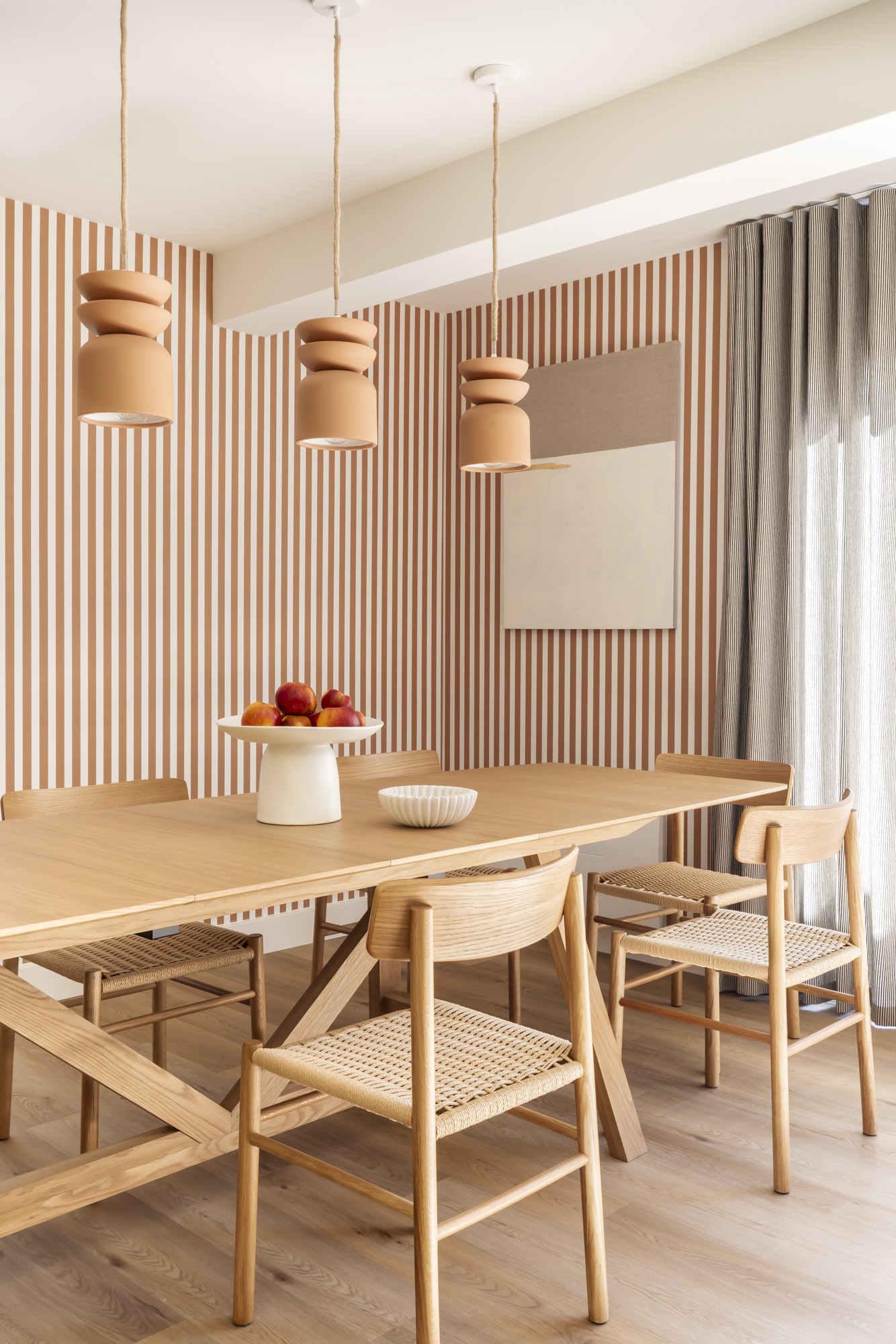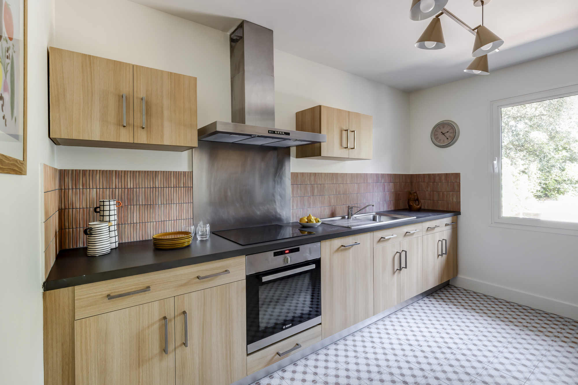 Dans cette élégante villa à Arcachon, la décoration mise sur la chaleur et la lumière naturelle. Les tons jaune lumineux et terracotta créent une ambiance solaire et accueillante, sublimée par des suspensions en terre cuite qui apportent authenticité et caractère.