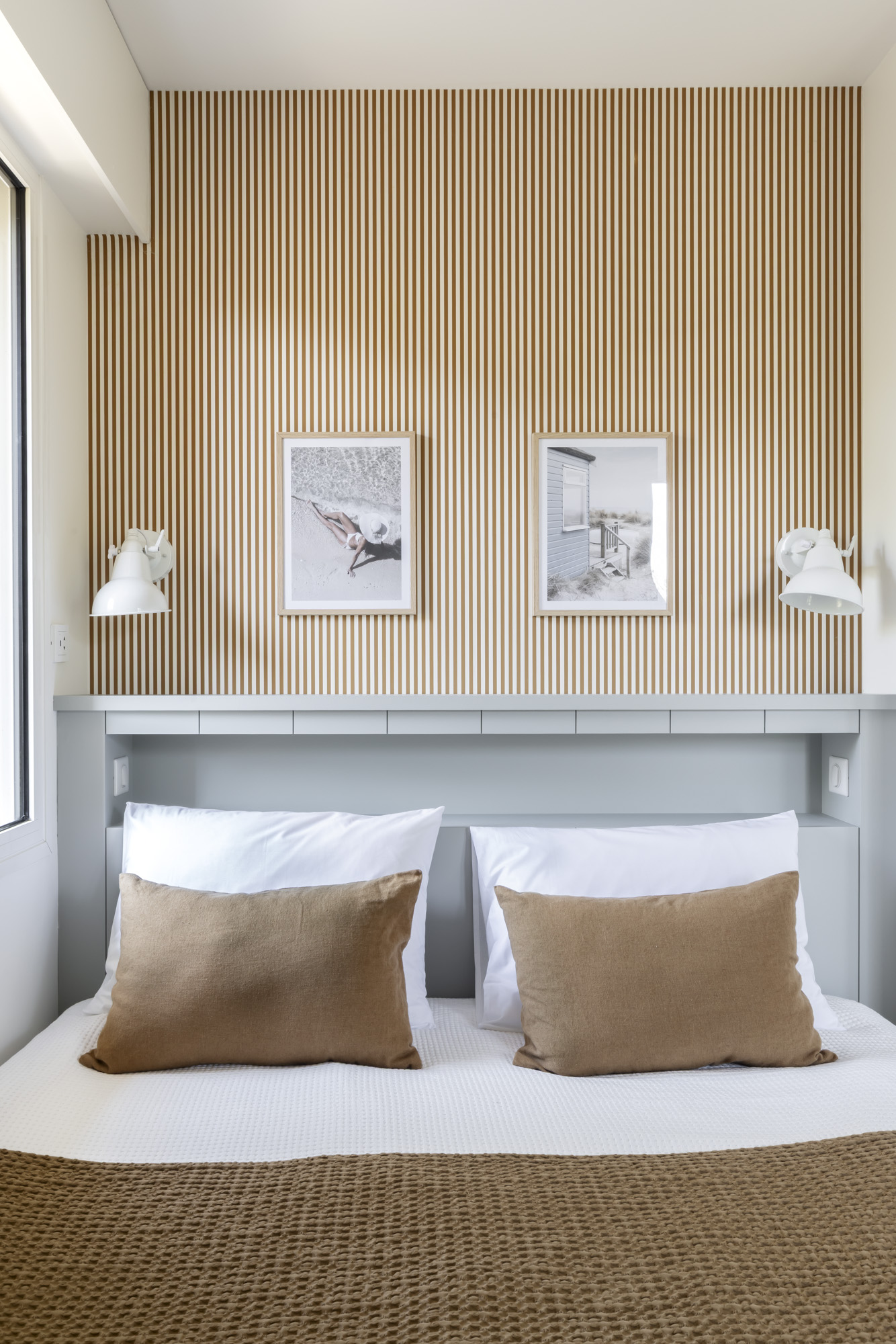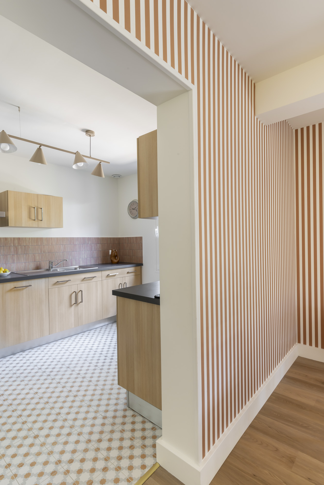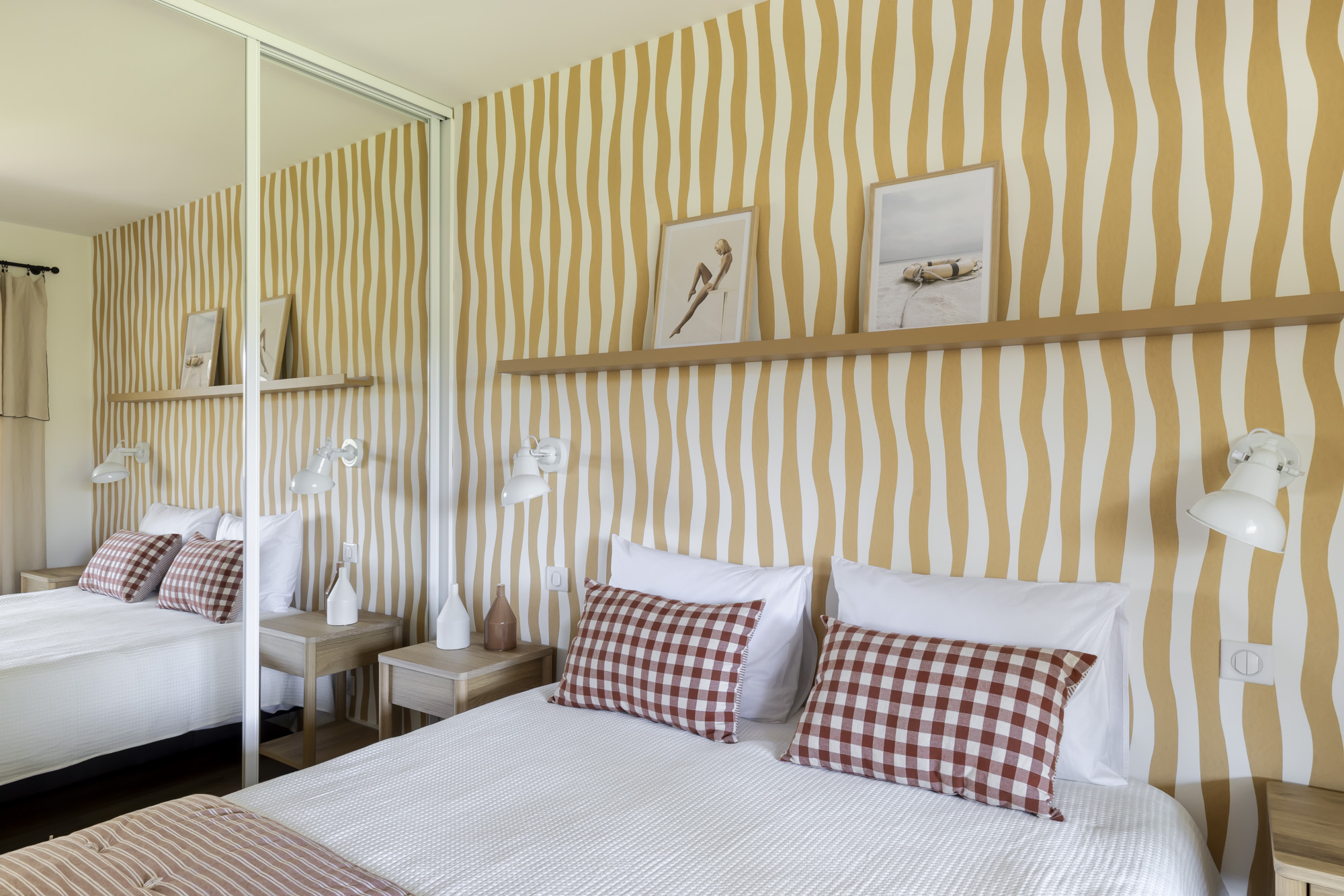 Les murs se parent de papiers peints Isidore Leroy et Casamance, aux motifs raffinés et aux textures élégantes. De grands rideaux en lin filtrent la lumière en douceur, tandis que le bardage bois et le chêne naturel insufflent un esprit chaleureux et intemporel.