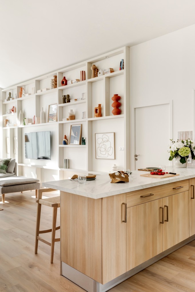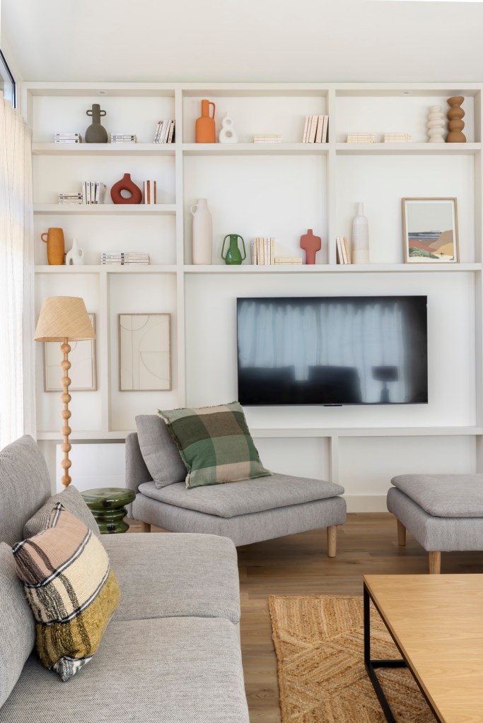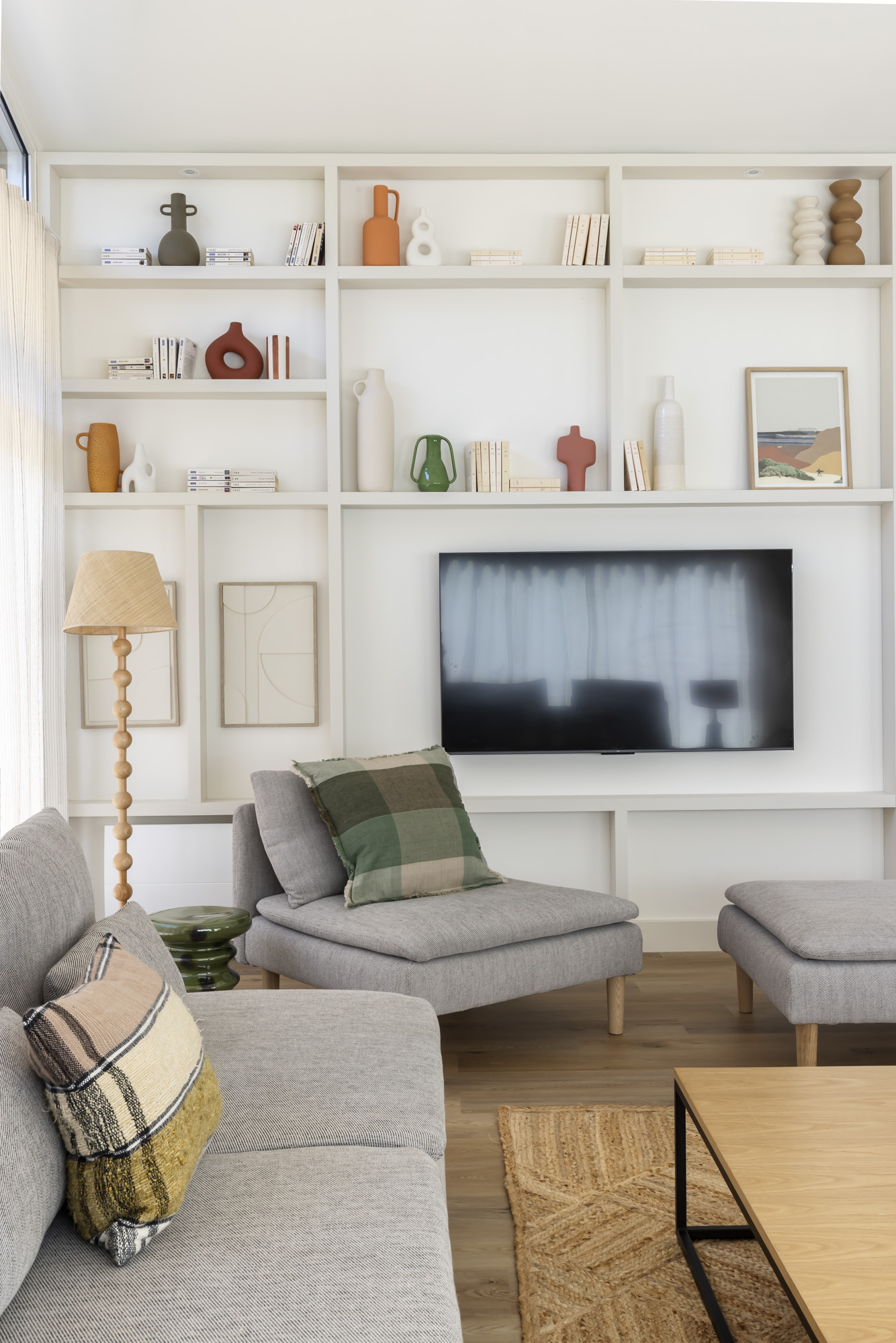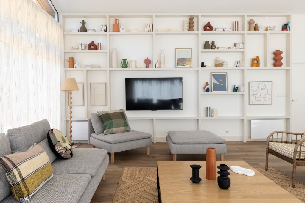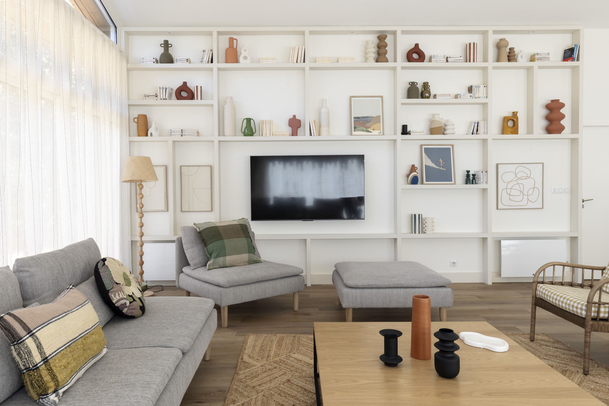 Le mobilier, sélectionné avec soin, provient notamment de La Redoute Intérieurs, alliant design contemporain et confort. Une bibliothèque sur-mesure avec des niches intégrées apporte du caractère et met en valeur livres et objets décoratifs.