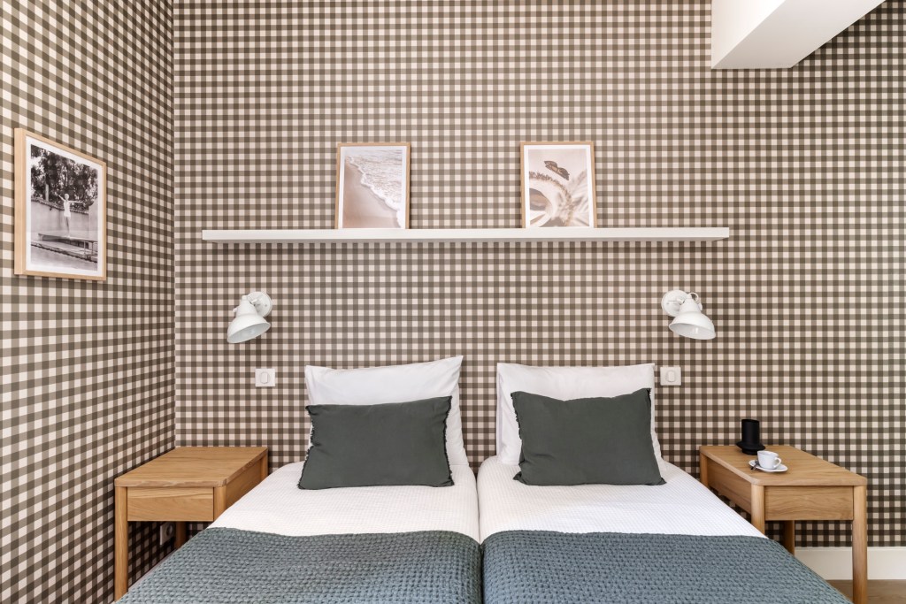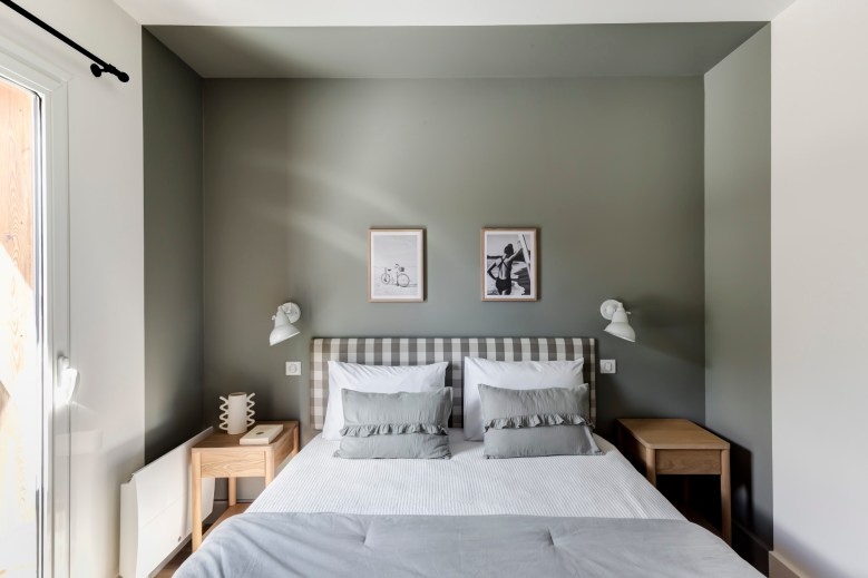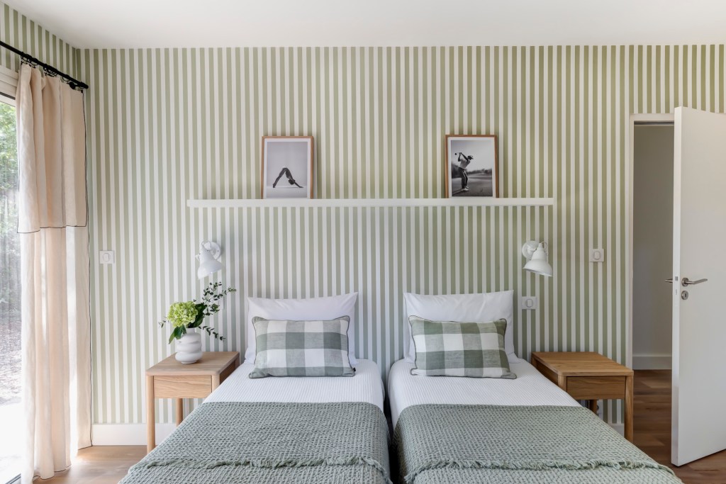 La décoration mêle harmonieusement tons de vert et de beige, créant une atmosphère douce et naturelle, parfaitement en accord avec l’environnement boisé. Les murs se parent de papiers peints Maison Jeannette et Isidore Leroy, aux motifs raffinés et intemporels.