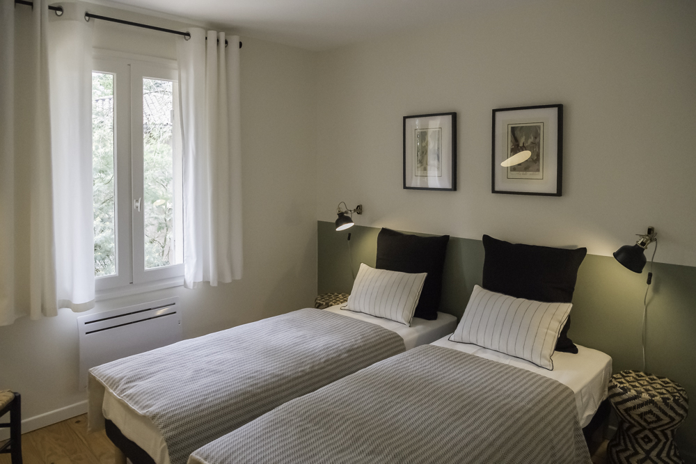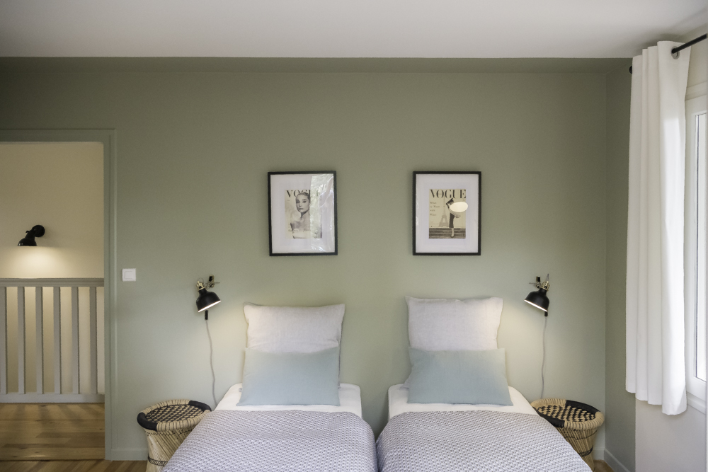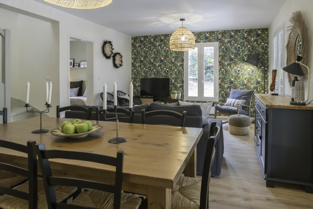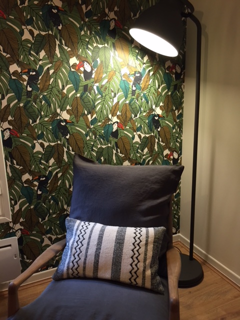 J’ai voulu garder l’esprit Vacances en mettant des éléments proches du thème de la nature : du papier-peint feuillages, du vert, du bois et des motifs avec des oiseaux.