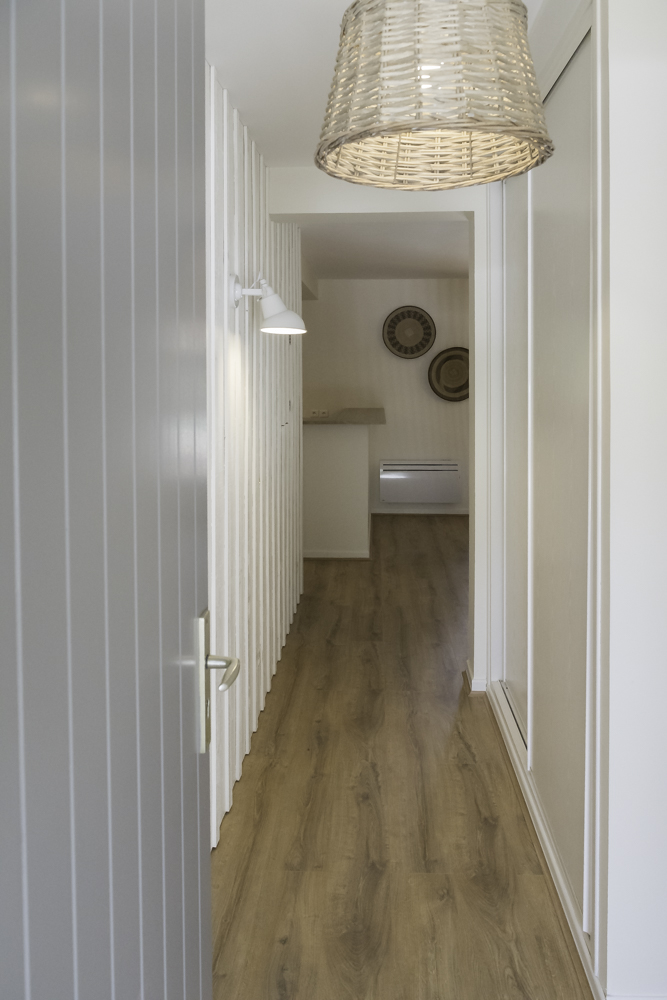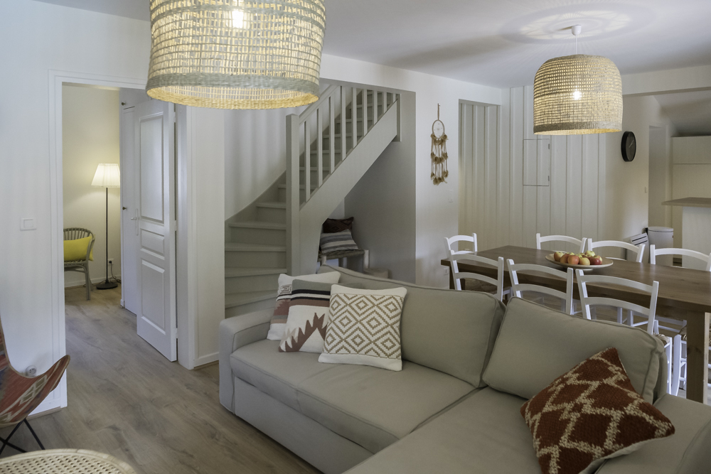Cette Villa de style « Cabane », un peu Bohème, dans les couleurs de Beige, Blanc et Bois, est une invitation aux vacances, simple, accueillante et apaisante.
