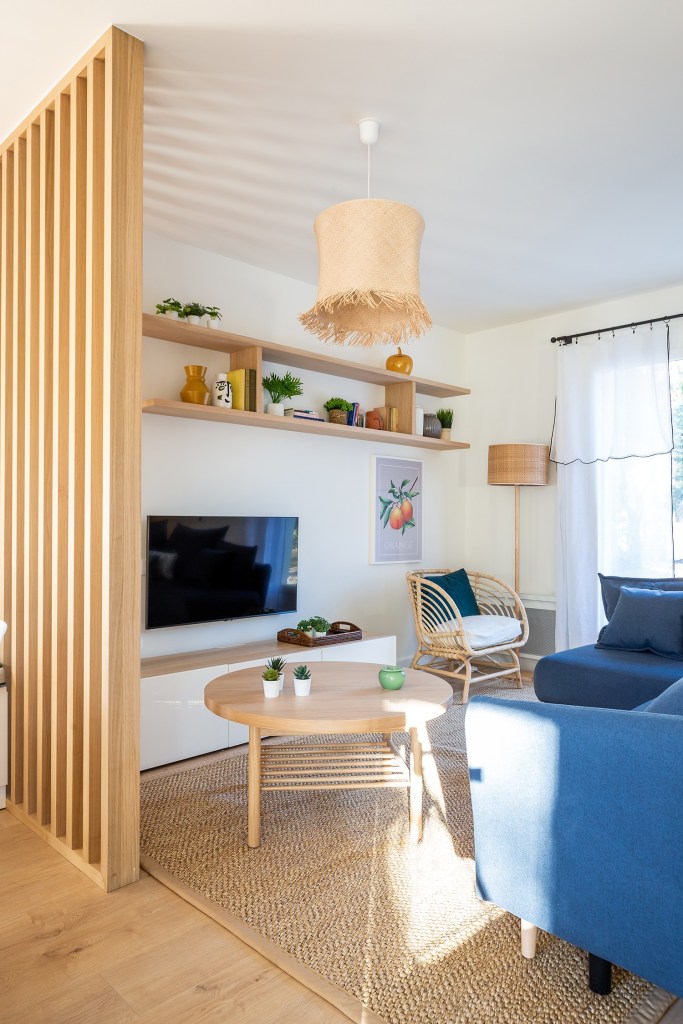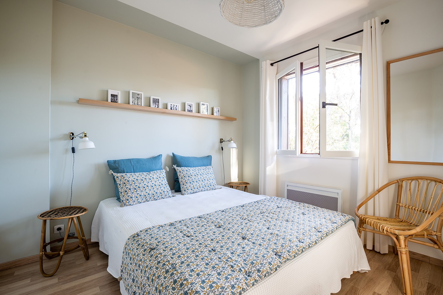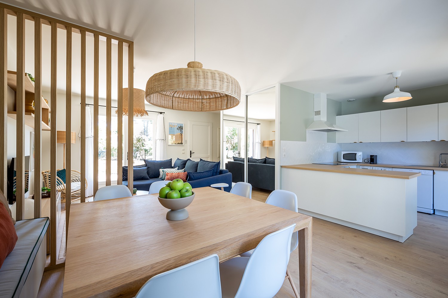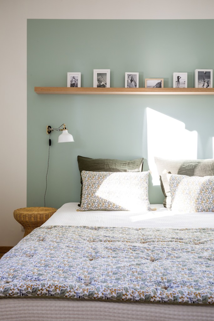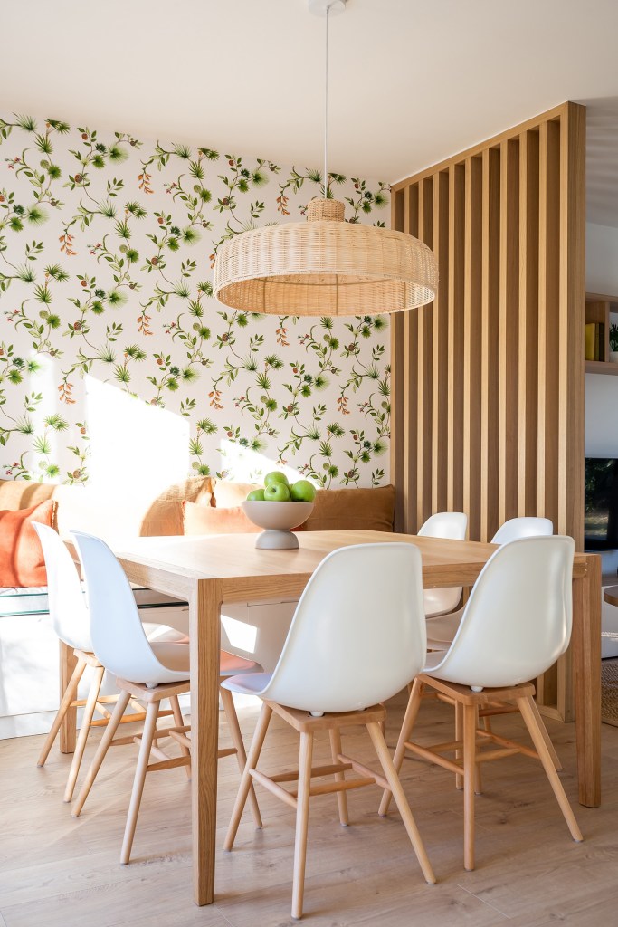 Un intérieur qui sent bon les vacances, l’odeur des pins et du sable avec comme fil conducteur un papier peint orné de pommes de pins caractéristiques de la région.